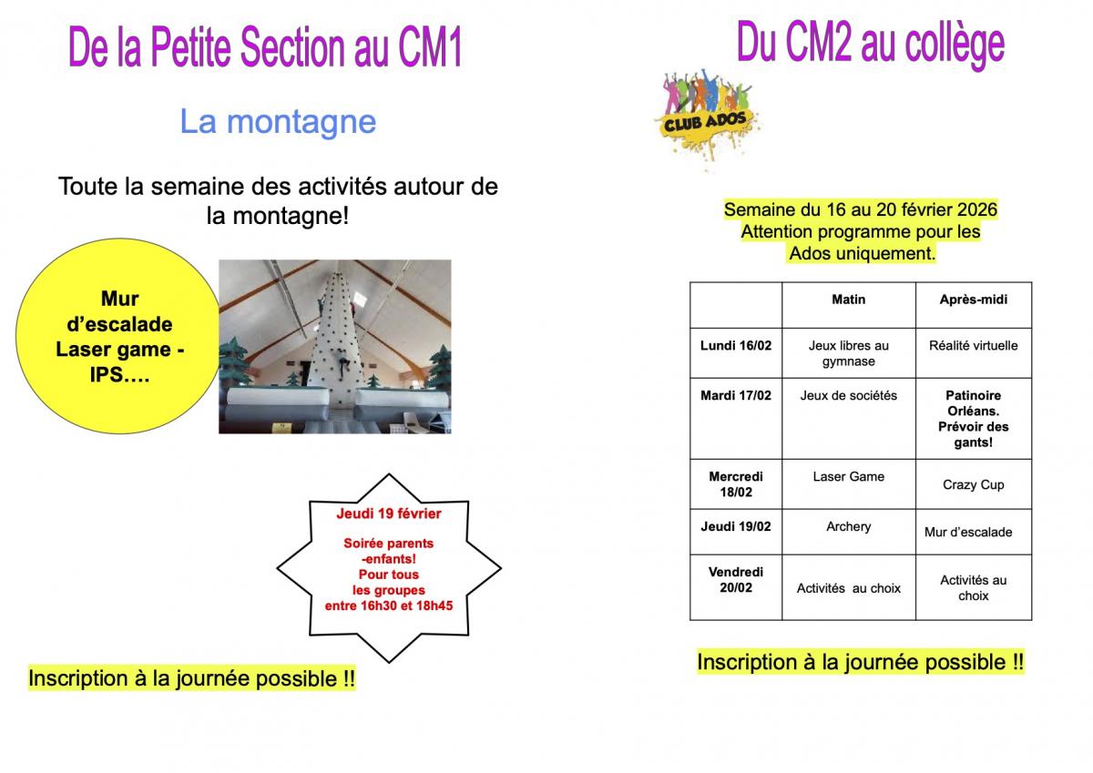 Dates d'inscription: vendredi 23 Janvier de 16h à 18h et samedi 31 Janvier de 10h à midi.